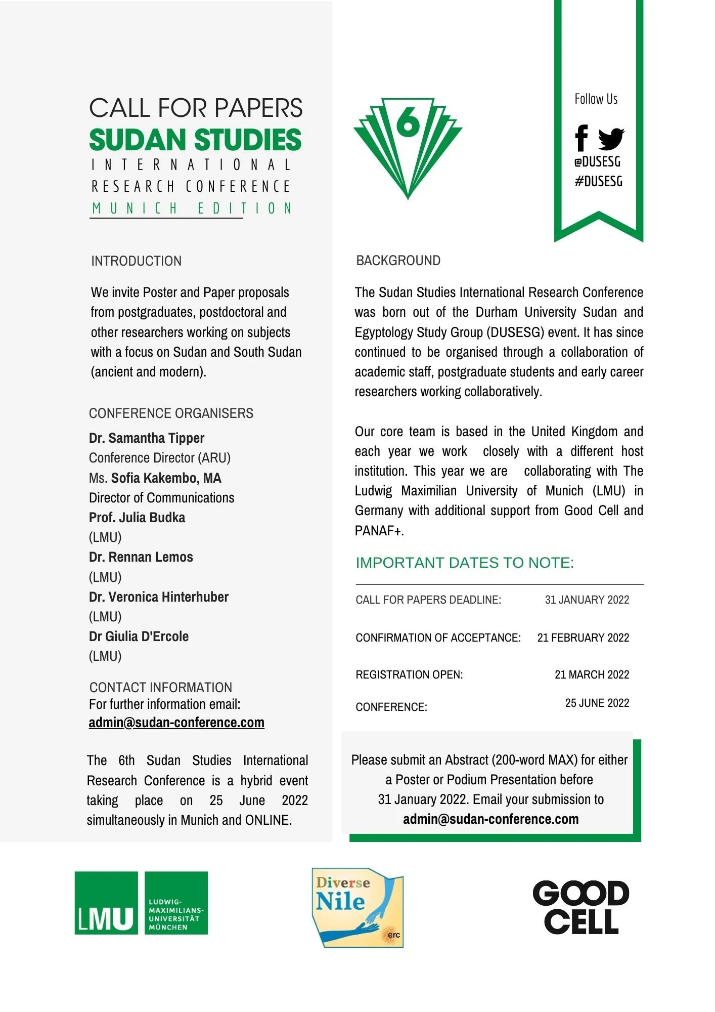 Call for papers is out now!! Abstracts (200words) due 31 March, 2021. Click the link to apply: https://www.morressier.com/call-for.../SUDAN-STUDIES-2021